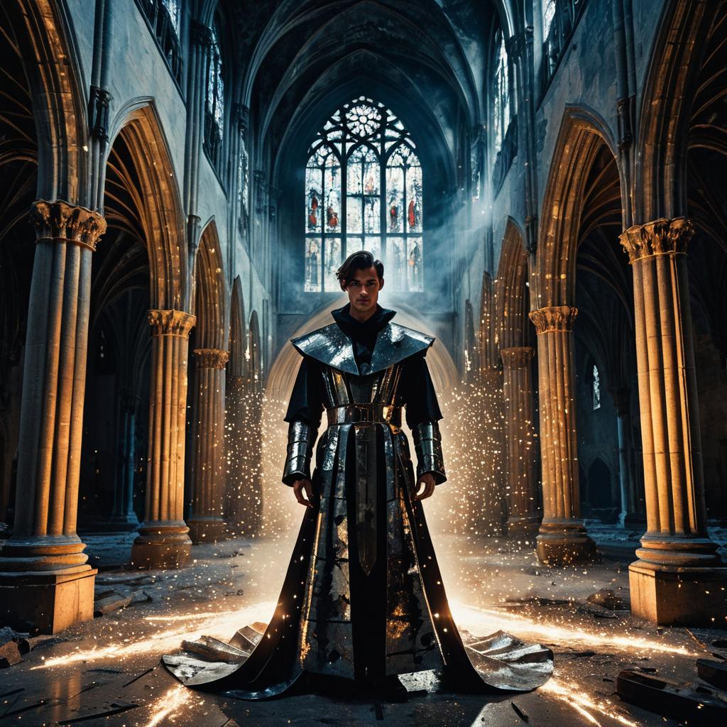 Dramatic high-fashion editorial featuring an avant-garde male model dressed in a metallic armor robe with a long flowing cape, standing in an abandoned gothic cathedral illuminated by ethereal candlelight beams and floating dust particles. The scene is set at twilight, showcasing intricate architectural details of the cathedral with cinematic lighting inspired by Stanley Kubrick and Greg Rutkowski. The image resembles an intricate oil painting with multiple exposure effects, styled for a Vogue cover.