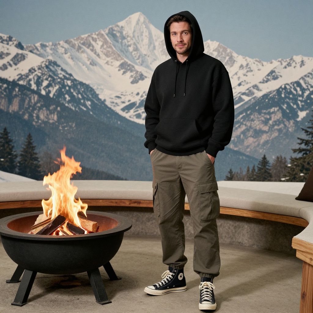 A man, fitted black hoodie, cargo pants, high-top canvas sneakers, muted earth tones, lightweight polyester, mountain lodge, snow-capped peaks, cozy fire pit, lithographic film style, relaxed pose, slight smile, hands in pockets.Man has masculine face and piercing eyes