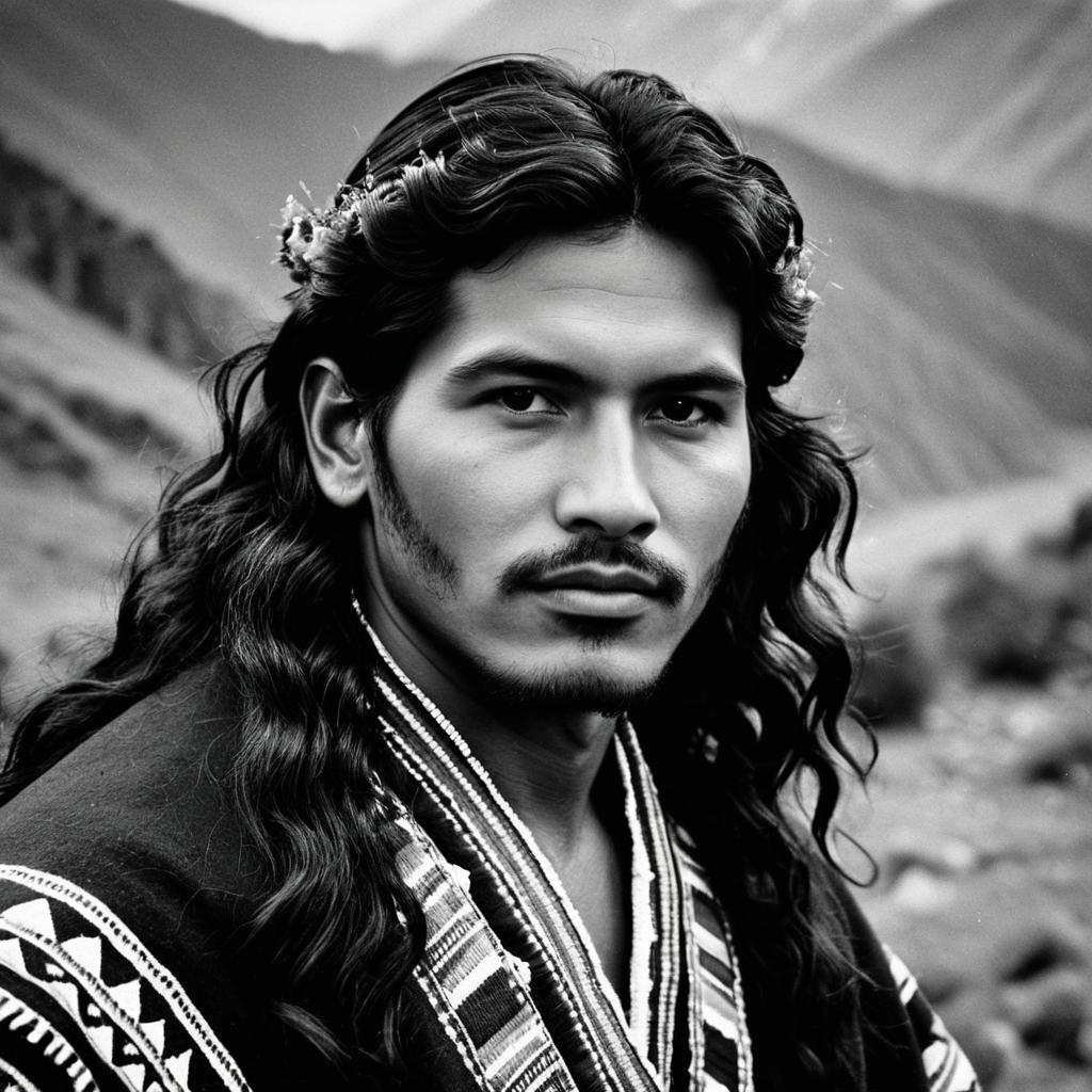 A front face photo of an impressive Andean man with a traditional image of beauty. Known for their black wavy hair, quiet confidence, and Inca lineage.