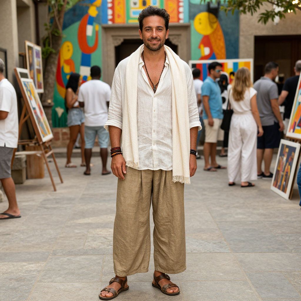 Portrait of a man wearing a flowy white linen shirt, earth-toned wide-leg trousers, distressed leather sandals, layered beaded bracelets, and a soft cotton shawl. He stands in a bustling courtyard with vibrant murals and diverse art exhibits in the background. The man has a relaxed smile and warm, inviting expression.