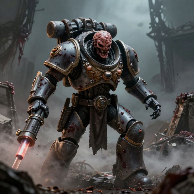 Death Guard artwork depicting a grim, plague-ridden warrior clad in corroded green armor, standing amidst a toxic, war-torn battlefield, with oozing decay and rusted mechanical elements, dark ominous sky in the background, vivid detailed sci-fi fantasy style.
