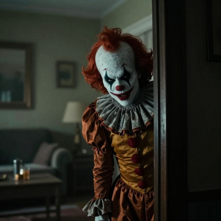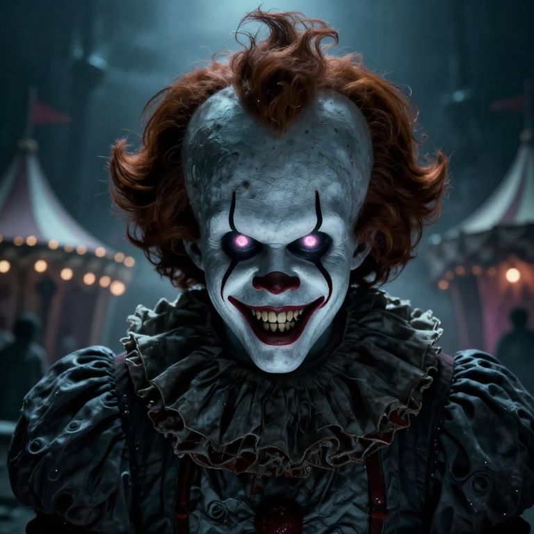Digital artwork of a creepy clown with pale blue face paint, glowing purple eyes, and a wide, menacing grin, standing in a dimly lit carnival