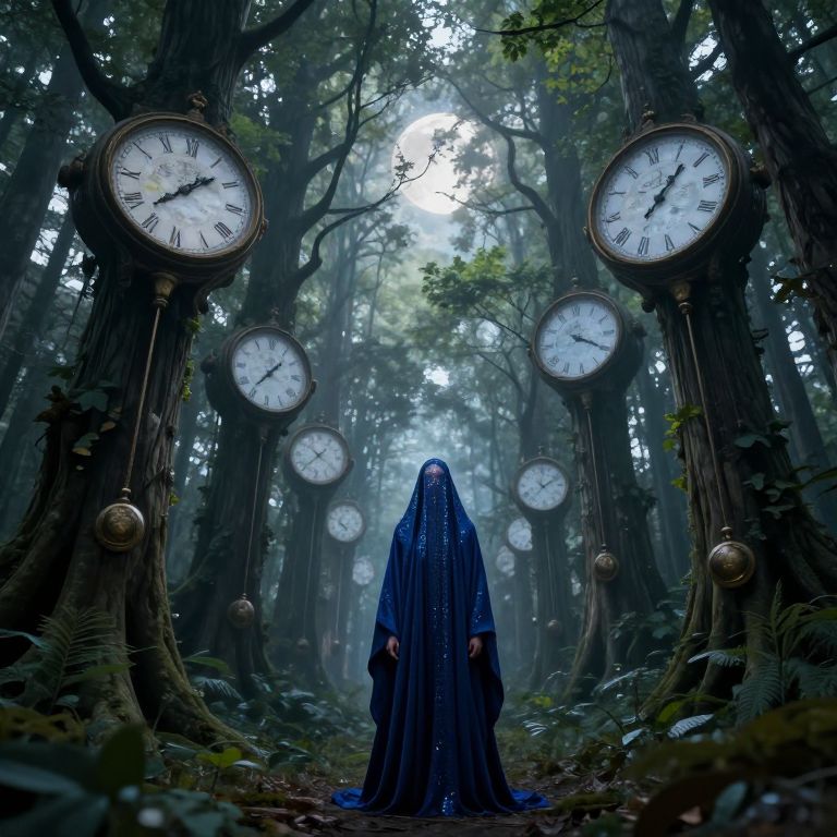 A mesmerizing digital artwork depicting an otherworldly forest where colossal trees transform into towering timepieces, their pendulums swaying in harmony with the rustling leaves. At the forest's core, an alluring figure shrouded in rich midnight blue robes stands enigmatic, his face veiled by a shimmering fabric that mirrors the surrounding arboreal clocks as if through a prismatic lens. Soft, diffused moonlight bathes the scene in a silvery glow, imbuing it with a tranquil yet mysteriously enchanting atmosphere that invites viewers into a realm where time and nature's beauty are inexplicably intertwined.