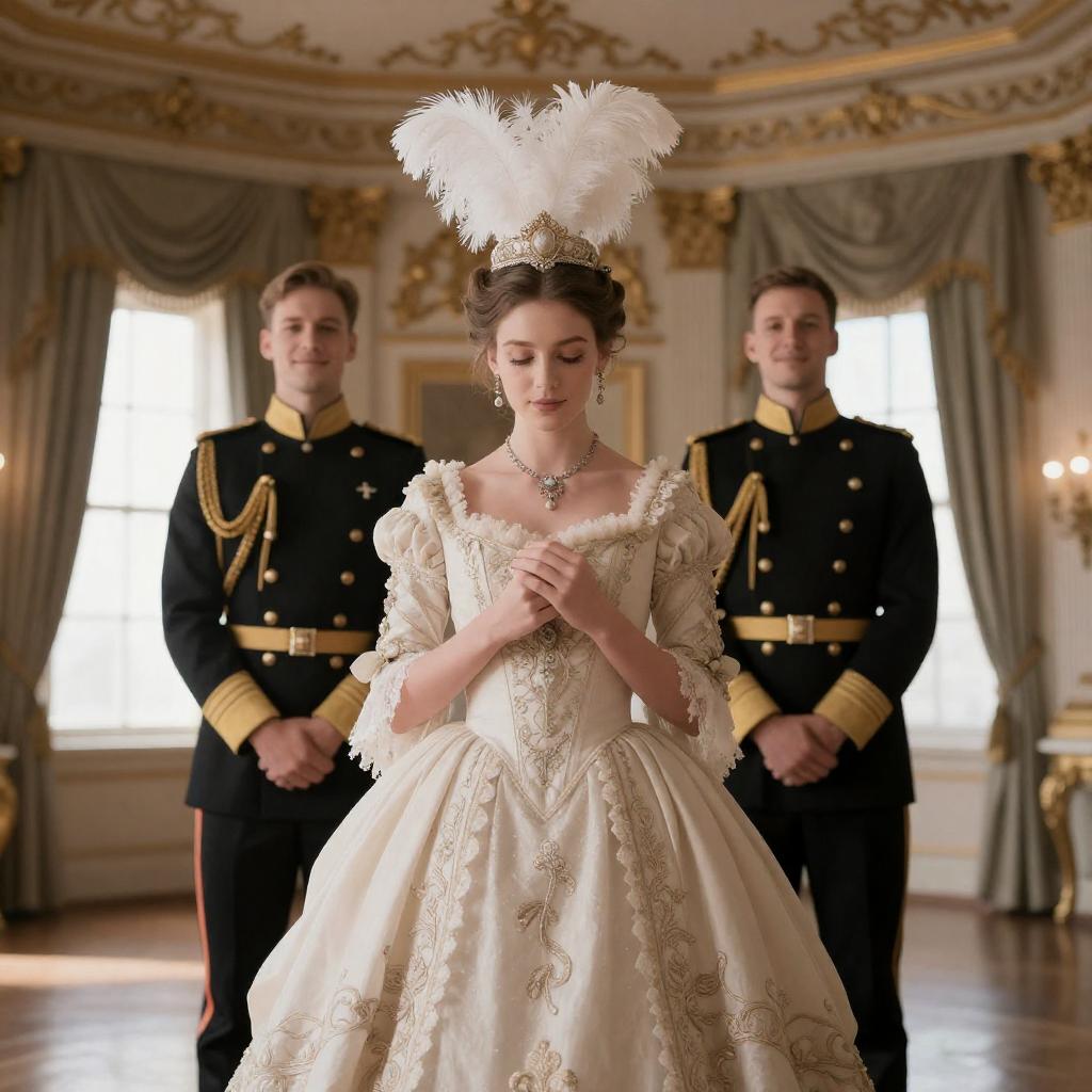 Photograph of a young woman in an elaborate, cream-colored, Victorian-style gown with intricate embroidery and a large, white feathered headdress. She stands in a grand, ornate room with gold-patterned ceiling and draped windows. Two men in black military uniforms with gold accents stand behind her, smiling. The woman looks down, clasping her hands near her chest.