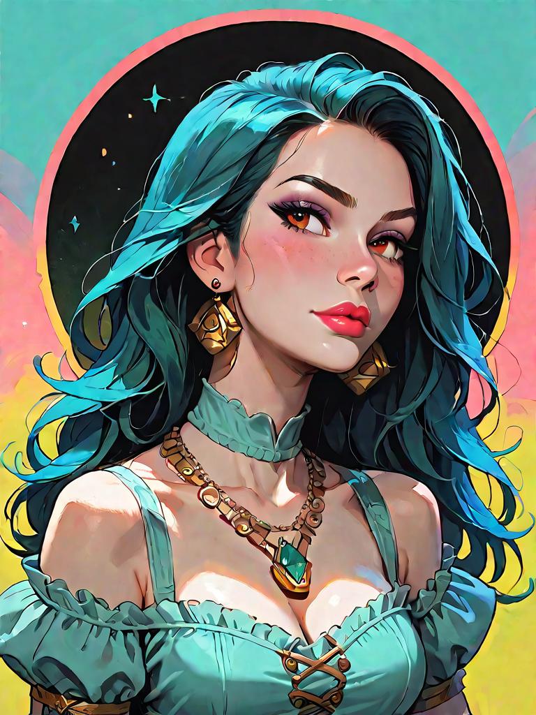 Illustration of an olive-skinned woman with short black curly hair adorned with blue and peach roses. She is dressed in a cream and blue dress featuring ruffled sleeves, a corset-style waist, and matching blue jewelry including earrings and a necklace. The background is pastel with soft circular designs and sparkling accents.