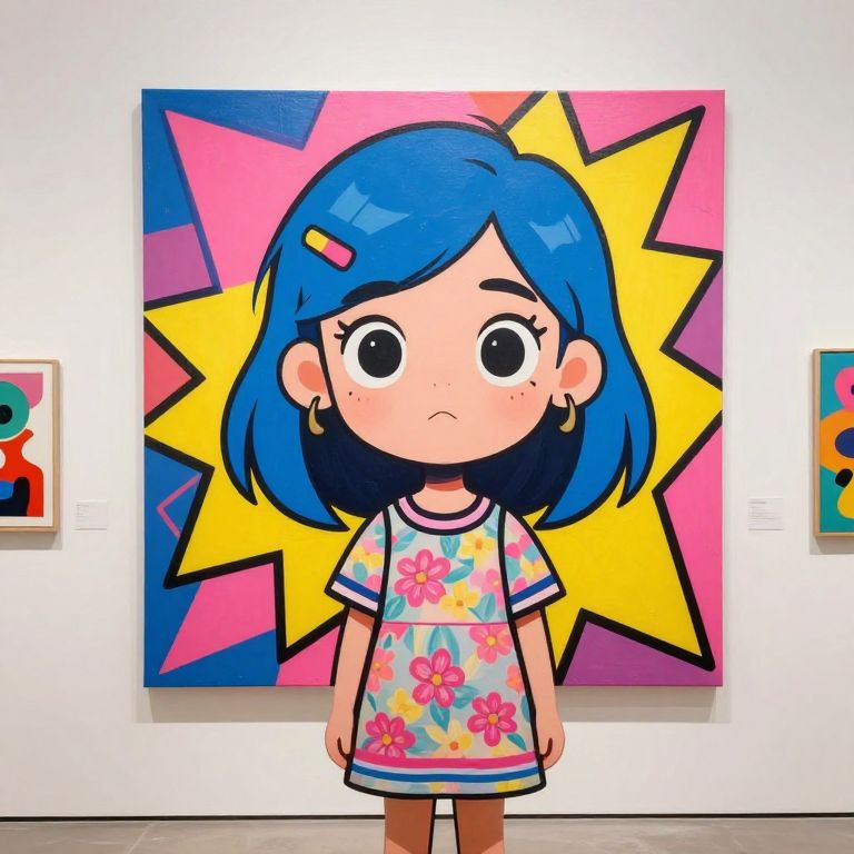A cartoon-pop style girl in a modern art gallery, standing in front of a massive canvas, her body made of comic bold graphic colors — electric blue, hot pink, and yellow — with exaggerated facial features and large eyes full of expression, wearing a pastel floral dress with sharp geometric borders, the setting filled with abstract pop art pieces, soft studio lighting, realistic textures and color contrast.