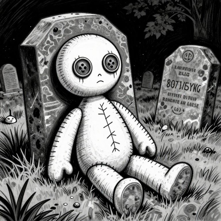 Black-and-white digital drawing of a stitched-up toy doll with large eyes, sitting between two grave markers in a grassy graveyard at night.