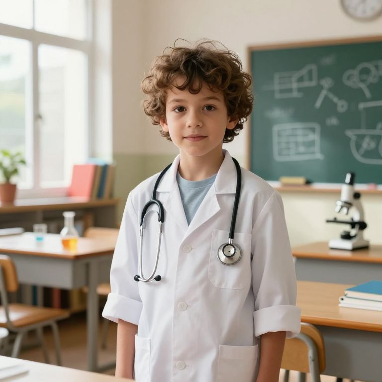 A young boy, around 10 years old, with curly brown hair slightly messy from play, wearing a clean white lab coat with sleeves rolled up to the elbows, a stethoscope gently looped around his neck, his bright, expressive eyes looking directly at the camera with curiosity and innocence, standing in a sunny classroom filled with colorful books, beakers, microscopes, and a chalkboard with scribbled scientific diagrams in the background, soft natural light filtering through large windows, casting gentle shadows and highlighting the details of the room, realistic and highly detailed style with lifelike textures, warm color tones, and a sense of quiet wonder and intellectual enthusiasm.