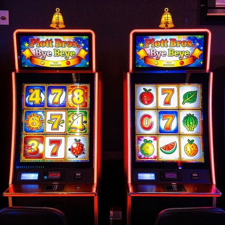 Two vibrant slot machines, labeled \"Plott Bros. Bye Bye,\" stand side by side against a dark background, featuring illuminated displays with colorful symbols, including sevens and fruit icons, and topped with golden bells.