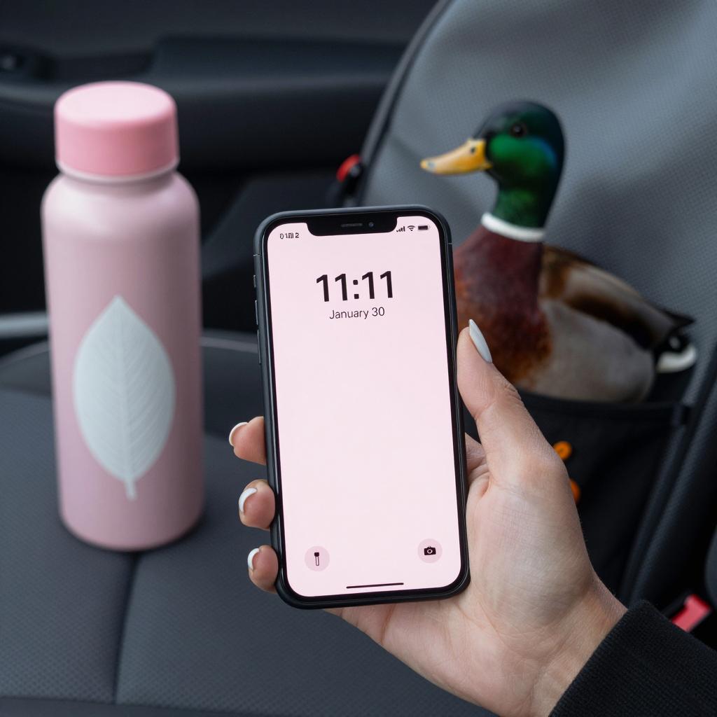 Close-up of a hand with white-painted nails holding a black-framed smartphone displaying a pink screen with the time 11:11 and date January 30. The background features a pink water bottle with a white leaf design on a car seat and a gray backpack with a realistic mallard duck design. The setting is inside a car with dark upholstery.