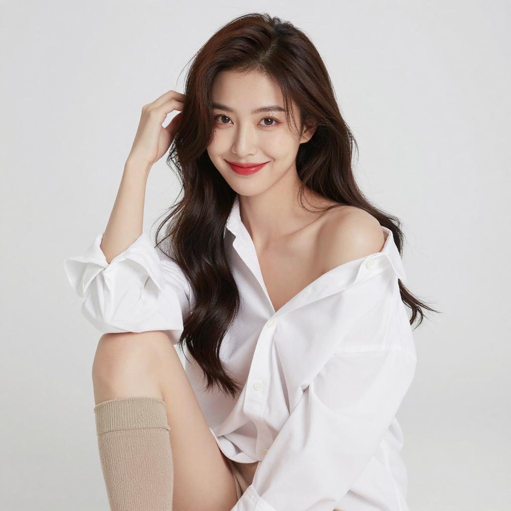Photograph of a young woman with long, dark brown hair and fair skin, wearing a white, off-shoulder shirt and beige thigh-high socks. She has red lipstick and a slight, confident smile, with one hand touching her hair. She is seated against a plain white background, creating a stark contrast with her dark hair and white shirt.