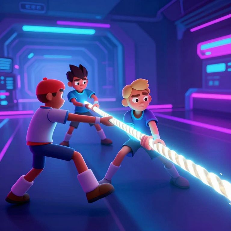 Tug of war online, animated characters pulling a glowing virtual rope in a futuristic digital arena, neon lights, dynamic action, intense competition atmosphere, cyberpunk style
