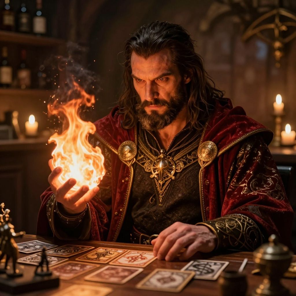 Close-up of a muscular dark-haired sorcerer with a beard, wearing a detailed robe with red and gold patterns, conjuring a glowing fireball in his hand. He is seated at a wooden table featuring miniatures, cards, and mystical items, inside a warm, cozy tavern with shelves of bottles and candles providing soft ambient light.