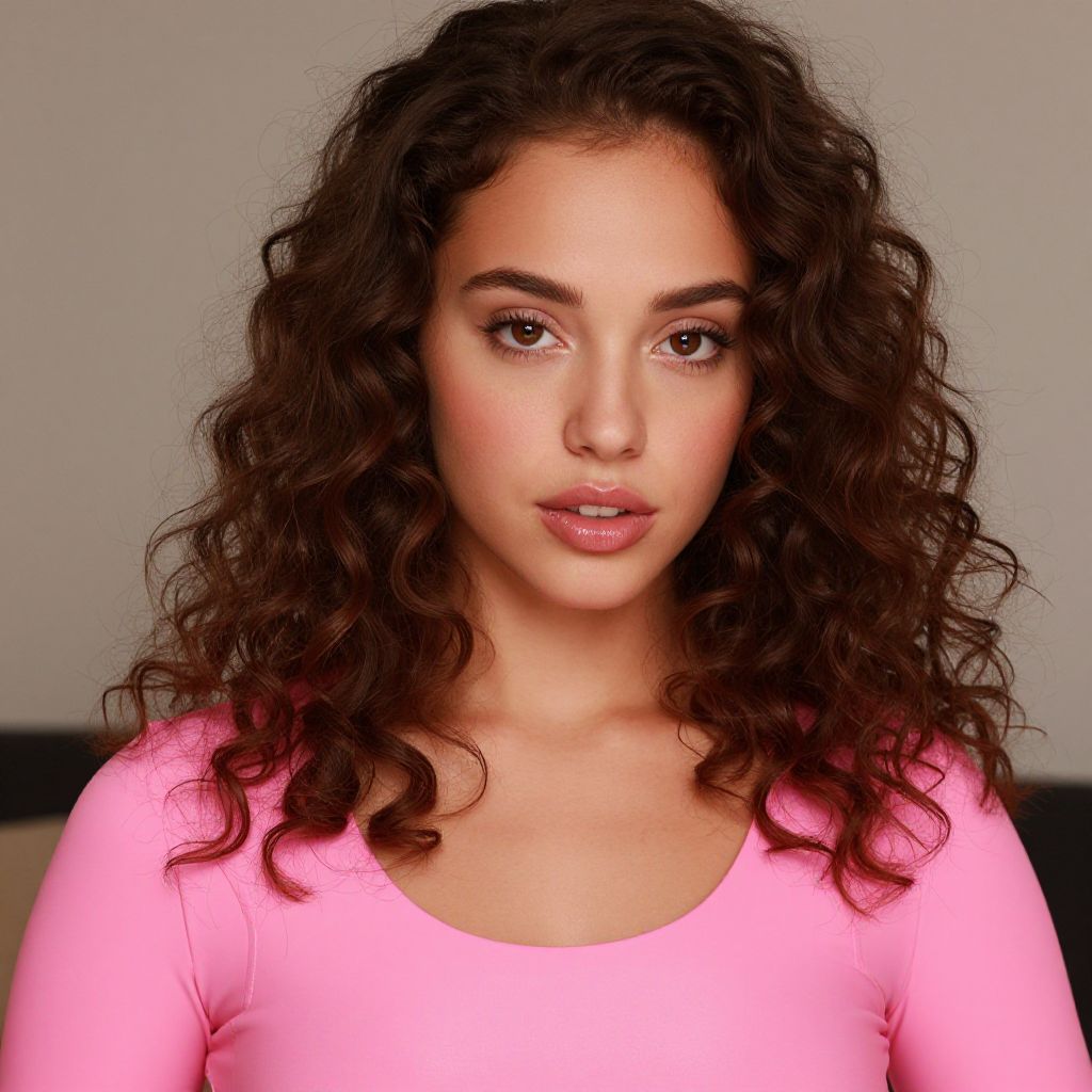 "grease pink costume, 1girl, solo, brown hair, curly hair, realistic, brown eyes, lips, looking at viewer, upper body Realistic photo of casual sexy person with pretty face"