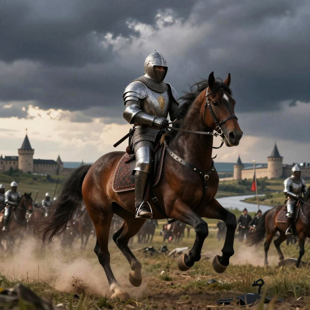 Putin riding horse in a historic battle scene, dusk lighting, stormy sky, armored horse wearing medieval armor, dynamic action pose, Russian landscape with castles and rivers, intense mood, realistic art style.
