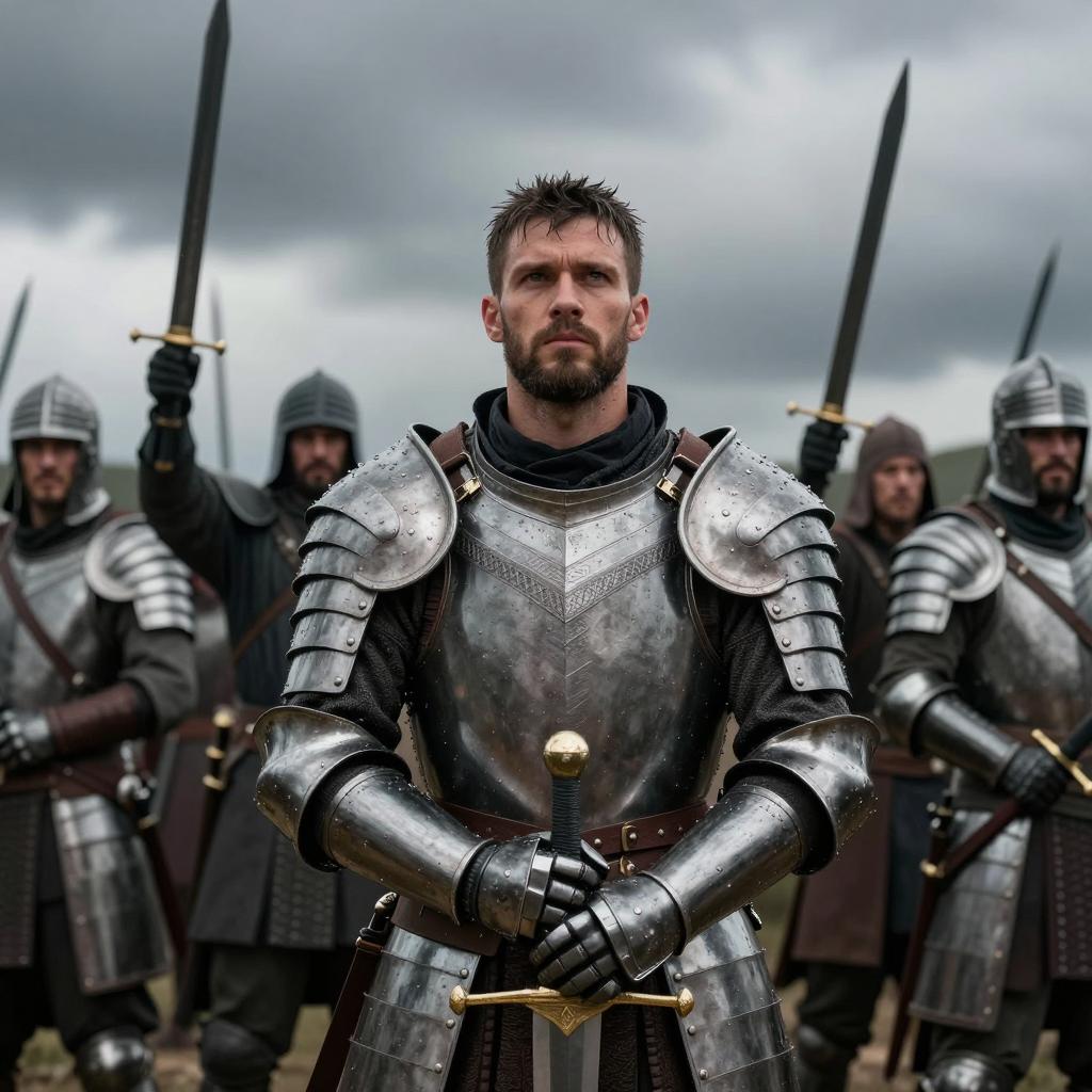 Silhouetted man in medieval armor with sword raised, shield in left hand, stands in dim barn with chains on right wall. Sunlight from arched window behind him casts shadows. Second person in blurred foreground. Another armored man stands in sunlit doorway. Barn has hay-covered floor and wooden gate.