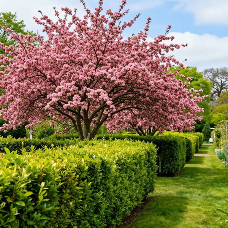 Photograph of a vibrant spring scene with a large, blooming pink cherry tree, surrounded by neatly trimmed green hedges and lush grass, under a