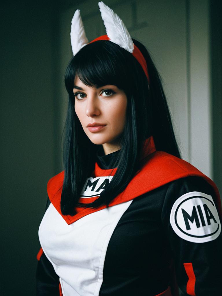 Portrait of a young woman with black hair wearing a Mia cosplay costume. The costume features a white and red design with a 'MIA' emblem on the chest and sleeve. She has white costume horns on a red headband, and the photo has a cinematic realism style with editorial glamour lighting.