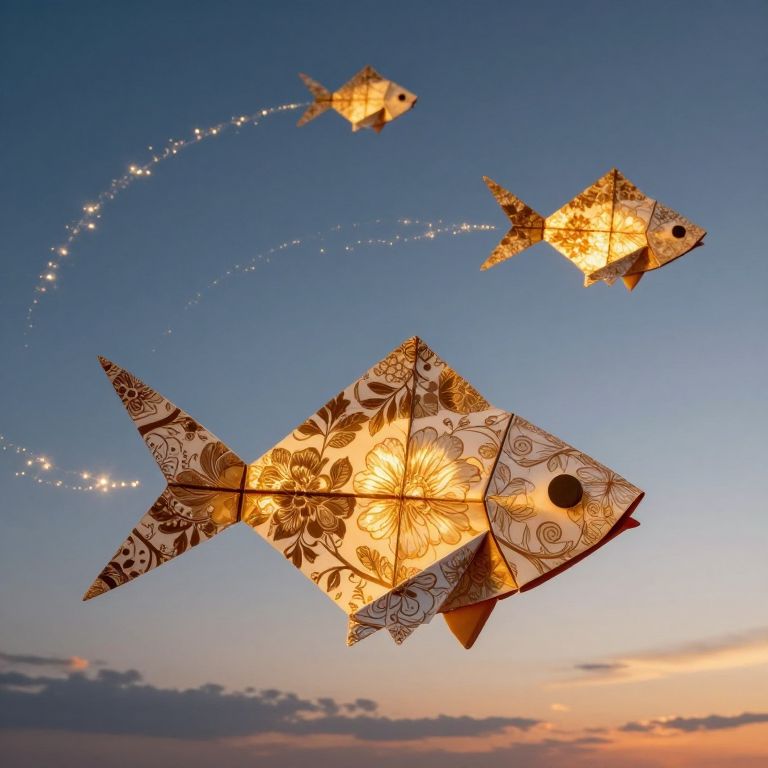 Giant origami fish, crafted with intricate floral patterns, glide gracefully through a twilight sky, their silhouettes illuminated by the golden hour as they leave shimmering trails behind them in this surreal, computer-generated artwork.