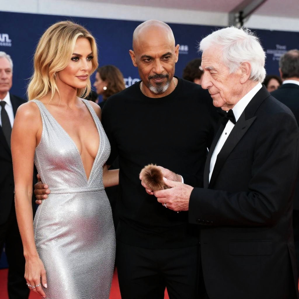 Photograph of three people at an event. Blonde woman in a tight, silver, cleavage-revealing dress on left, bald man with goatee in black tunic in center, elderly man with white hair in black suit on right. Elderly man holds small, brown, furry object, handing it to bald man. Background includes other people, blue banners, and event signage. Intense expressions on blonde woman and elderly man.