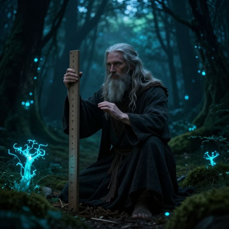 Ambrosio, an ancient wise sage wearing flowing robes made of leaves and vines, sitting cross-legged on a moss-covered stone, deep forest background with soft sunlight filtering through dense foliage, fantasy character portrait, highly detailed