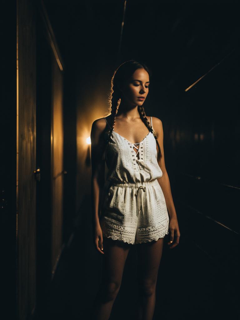 Young woman standing against a plain white studio background wearing a white cropped tank top with lace trim and black wide-leg pants featuring a small red floral print and adjustable drawstring waist. She accessorizes with stacked multicolored bracelets and flat open-toed sandals with red bow details, captured in low light casting a shadow on the wall.