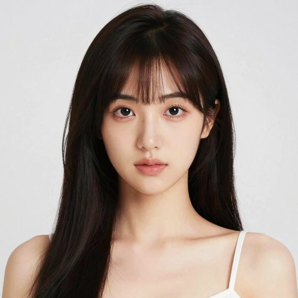 This is a close-up photo of a young woman with pale skin and dark brown, straight hair with bangs. She has large, almond-shaped brown eyes with heavy black eyeliner and mascara, and bright red lipstick. Her right hand is gently touching her cheek, and she's gazing slightly upward with a subtle, confident smile. The background is plain white, making her features stand out.