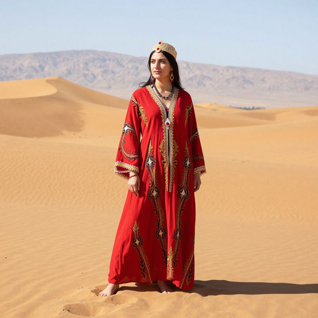 Woman wearing vibrant Moroccan Berber attire stands gracefully against a backdrop of golden sand dunes and distant mountains, her flowing red dress adorned with intricate patterns and traditional accessories.