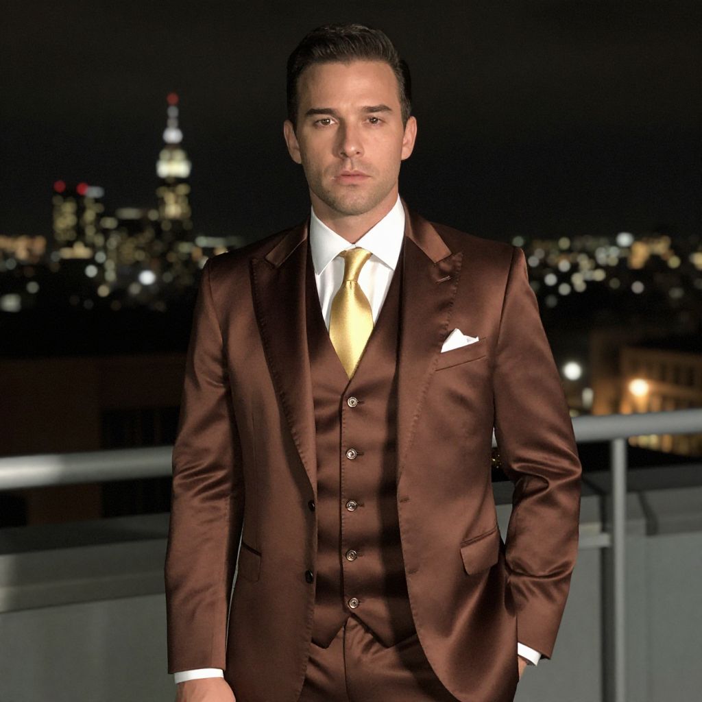 Photograph of a handsome man with short dark hair and light skin, standing on a rooftop at night. He's wearing a shiny, brown satin three-piece suit with a white shirt and gold tie, complemented by a white pocket square. The city lights in the background are slightly blurred, with a tall building's light tower visible. He looks directly at the camera with a serious expression.