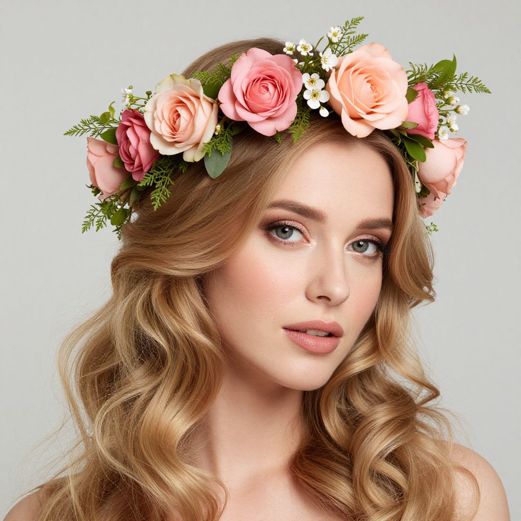 Elegant woman wearing a delicate flower crown adorned with vibrant pink and peach roses, interspersed with green foliage and small white blossoms, complementing her soft blush makeup and flowing golden hair styled in loose waves, all set against a minimalist background.