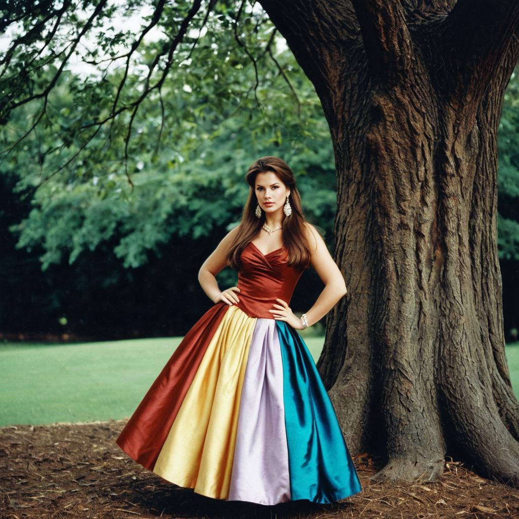 A young woman with long brown hair wearing elegant jewelry and a sleeveless satin dress with a multicolored skirt stands confidently beside a large tree in an outdoor park setting. The dress features rich brown, yellow, lavender, and teal panels. The scene is set amidst lush green foliage.