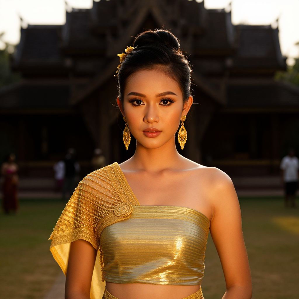 Photograph of a young Southeast Asian woman with dark hair in an intricate updo, wearing a shimmering gold and silver strapless top with shoulder armor, and elaborate gold earrings. She stands in front of a dark, ornate temple with pointed roofs, bathed in warm, golden light. Her expression is calm and confident. The background includes blurred figures and a grassy courtyard.