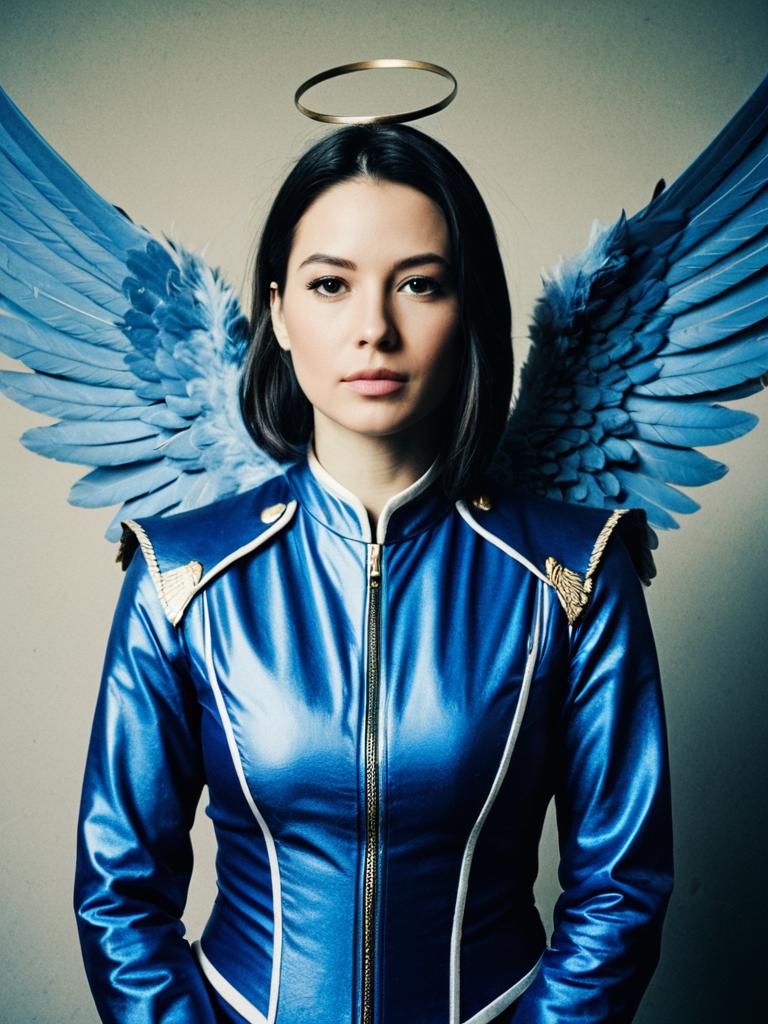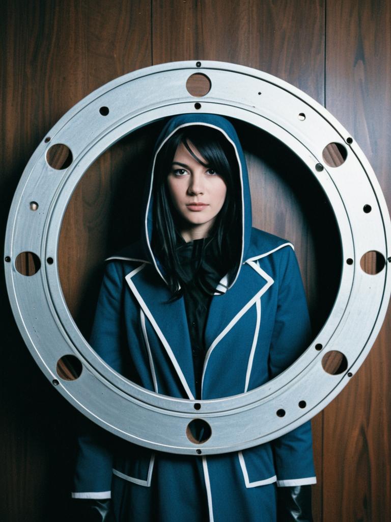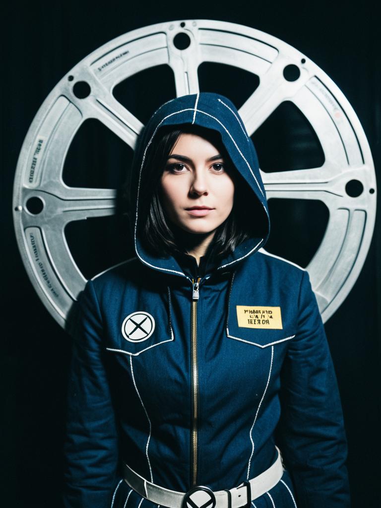 Photorealistic portrait of a young woman wearing a blue hooded costume with white stitching and a white belt, standing in front of a large silver film reel. The costume features patches, including a crossed circle symbol and a yellow patch with text, creating a cinematic cosplay look.