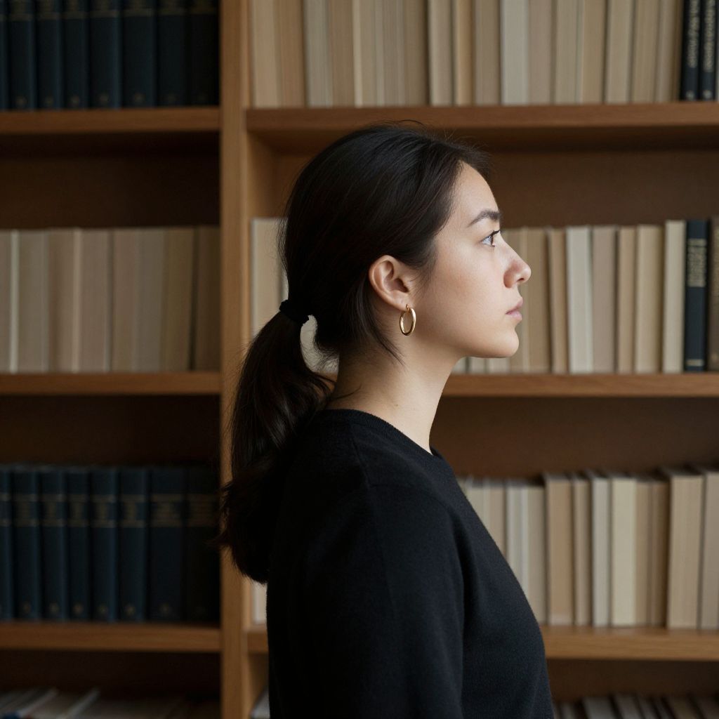 Contemplative woman stands in profile against a backdrop of wooden bookshelves filled with neatly arranged books, her dark hair tied back and adorned with gold hoop earrings, as she gazes thoughtfully into the distance.