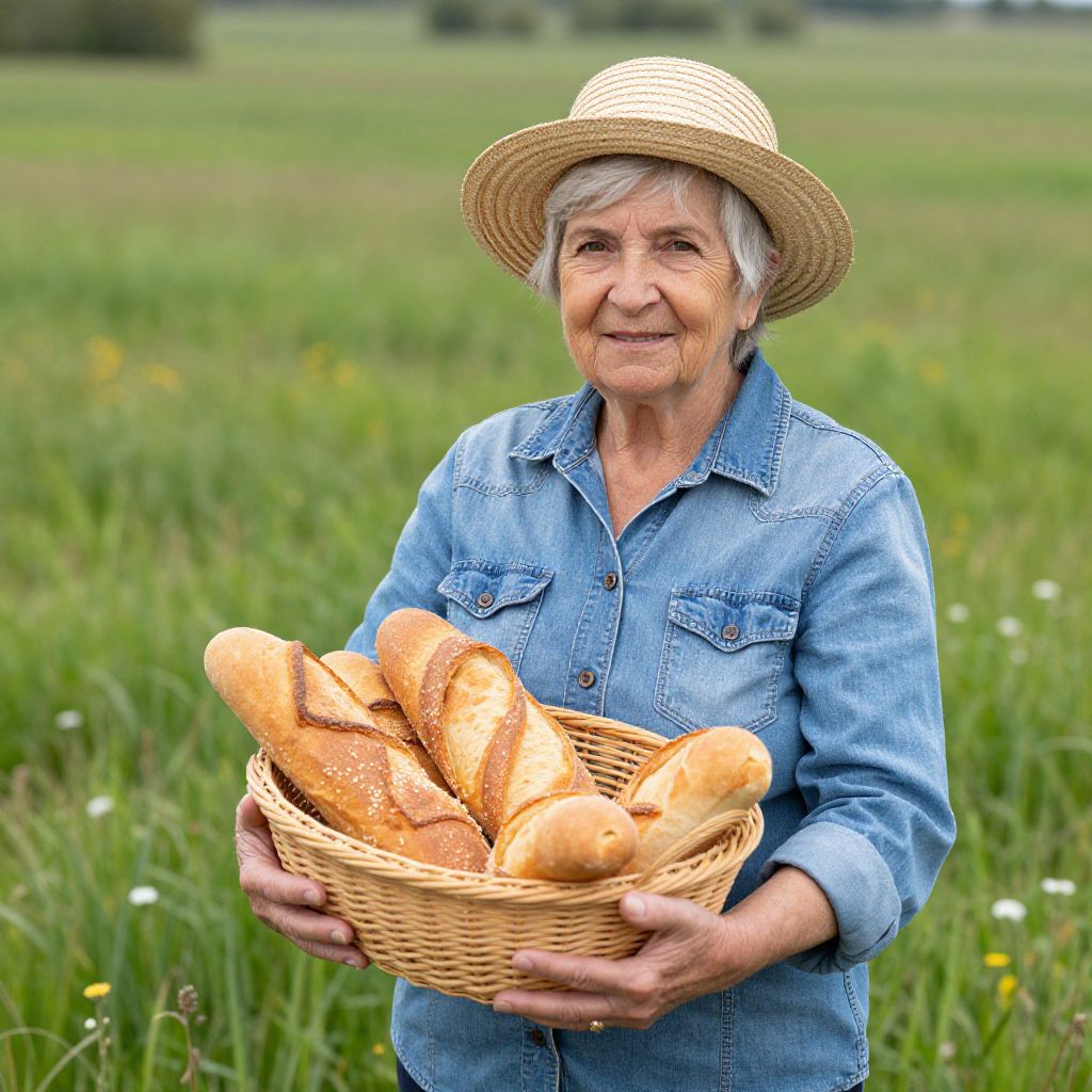Photograph of an elderly white woman with gray hair, wearing a straw hat and denim shirt, holding a basket of freshly baked baguettes in a