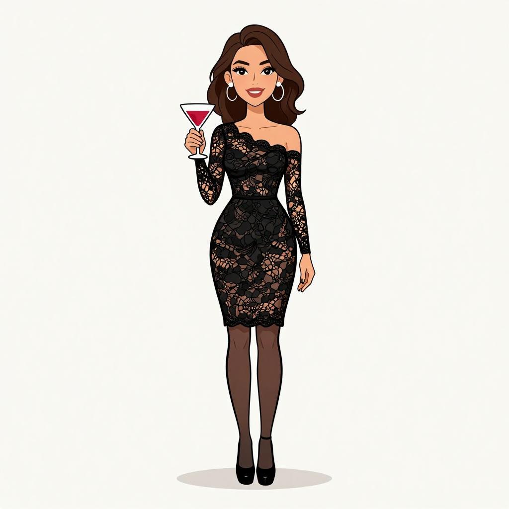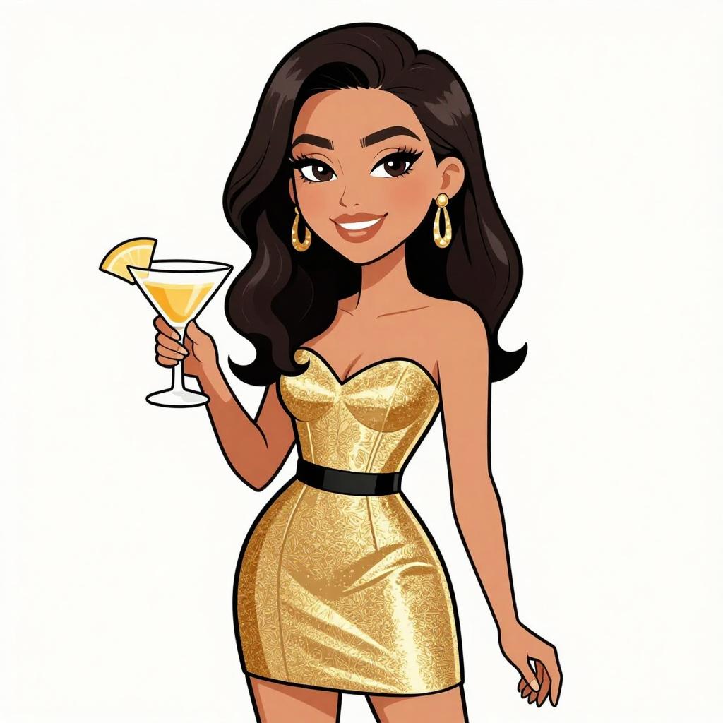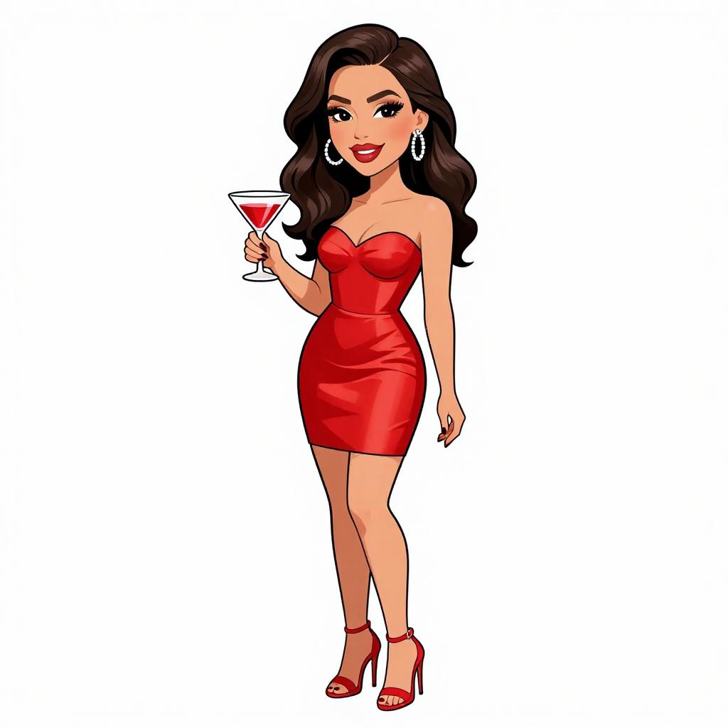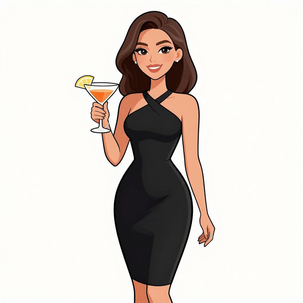 Cartoon-style illustration of a smiling woman with long dark hair, wearing a pink halter dress, black heels, holding a martini.