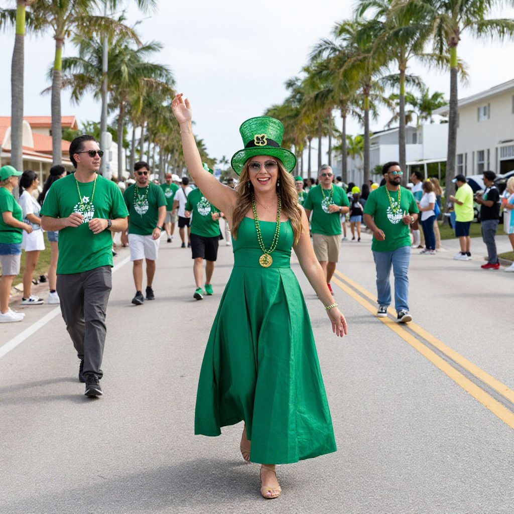 Parade-goers celebrate the vibrant atmosphere of the 2018 Delray Beach St. Patrick's Day Parade, with a woman in a flowing green dress and matching hat leading the procession down a palm-lined street, while spectators line both sides of the road.