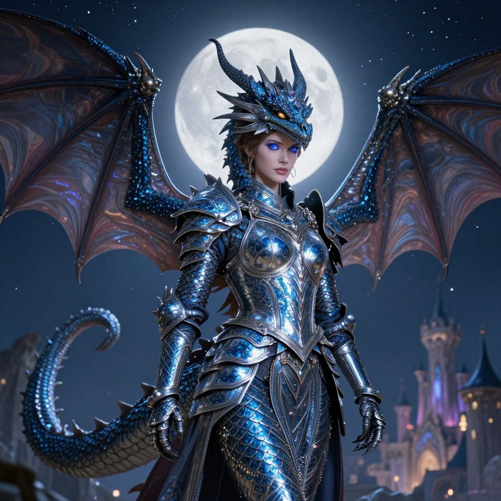 In this captivating image, a majestic dragon stands tall and proud, its scales shimmering with intricate patterns of blue and silver. The dragon's wings are outstretched, its tail coiled elegantly behind it, as it guards a woman adorned in elaborate armor that mirrors the dragon's regal appearance. The woman's face is illuminated by the ethereal glow of the full moon, casting a serene light upon her features. Her eyes, a striking shade of blue, gaze directly into the viewer's eyes, creating a sense of connection and intrigue. The background is a breathtaking blend of dark, star-studded skies and a distant, mystical castle, adding to the otherworldly atmosphere. The composition is masterfully crafted, with the dragon and the woman positioned centrally, their forms complementing each other perfectly. The overall effect is one of harmony and balance, with the interplay of light and shadow, the detailed textures of the dragon's scales and the woman's armor, and the vibrant colors of the moon and the castle creating a visually stunning and emotionally evocative scene.