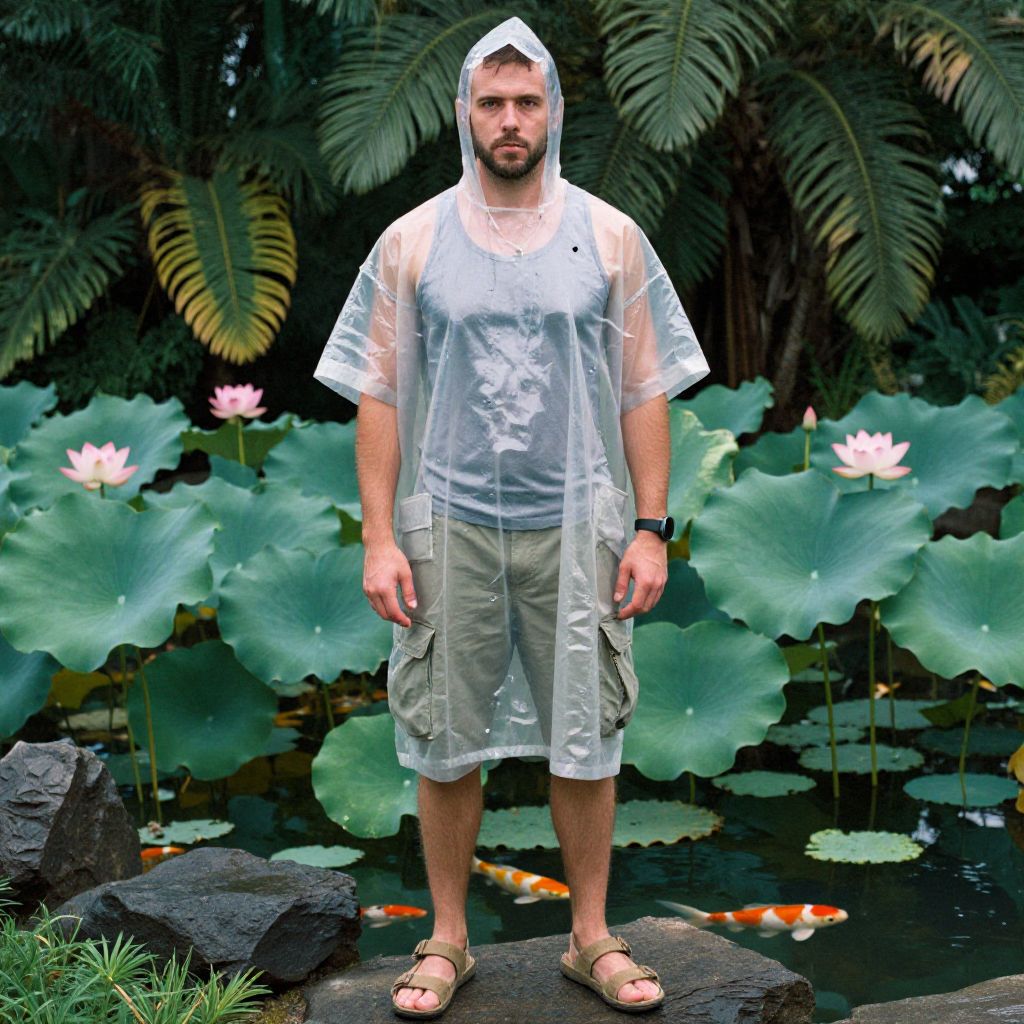 A man, translucent rain poncho, olive green cargo shorts, rugged tan sandals, gray athletic tank top, lush tropical foliage, serene koi pond, vibrant lotus flowers, lithographic film style, relaxed expression Man has masculine face and piercing eyes
