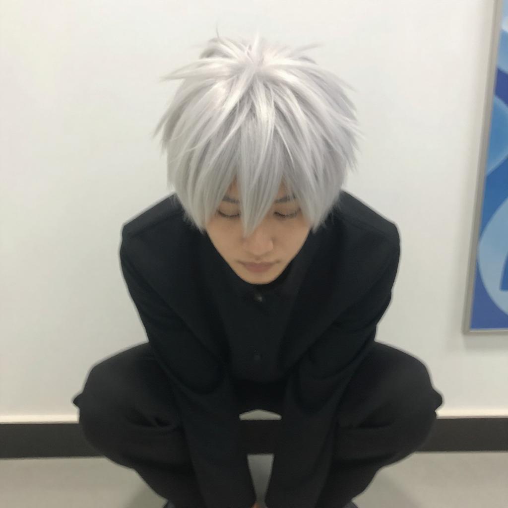 Blurry photograph of a person with white, spiky hair, crouching down, facing forward. The background is a white wall with faint and a blue patterned object on the right. The person's face is partially obscured by their hair.