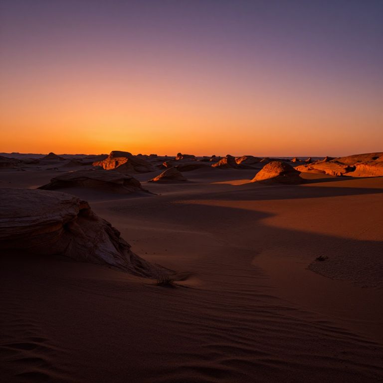 Photograph of a desert landscape at sunset. The sky transitions from deep purple at the top to vibrant orange near the horizon. Silhouetted sand dunes and rocky formations dominate the foreground, with the sunlight casting warm, golden hues on the edges. The sand appears smooth in some areas, with ridged textures in others. The scene evokes a sense of tranquility and vastness, with the colorful sky contrasting against the dark, shadowed dunes.