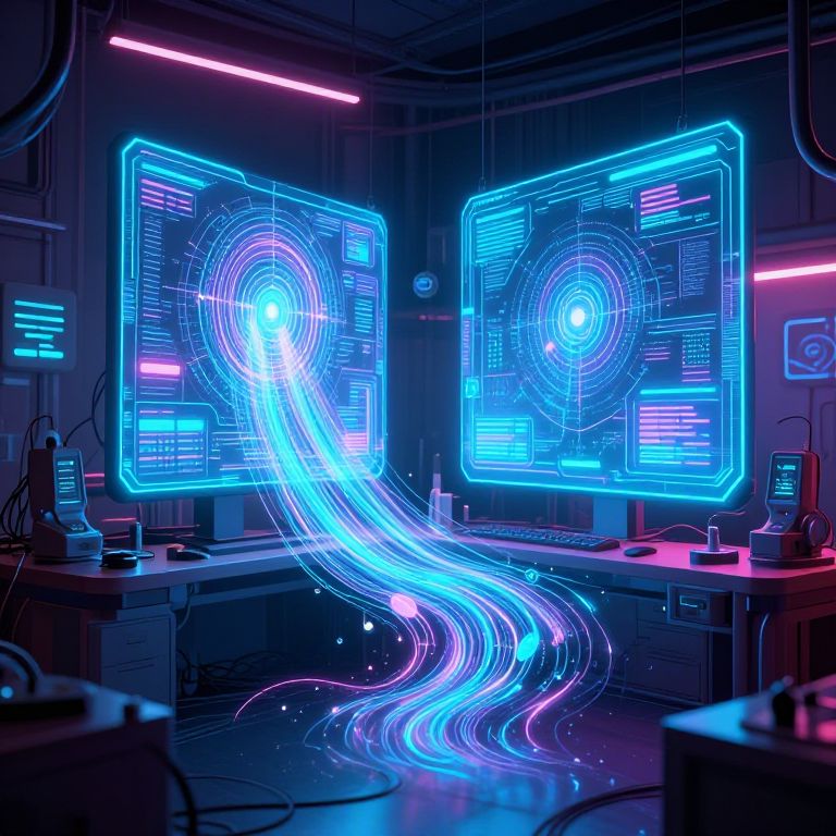 Photograph of a futuristic, neon-lit control room. Two large, glowing blue holographic screens dominate the background, displaying intricate, circular digital patterns with bright white centers. A vibrant, wavy blue light trails from the left screen, curling towards the right screen. The room is dimly lit with pink and purple neon lights, casting a cyberpunk aesthetic. Desks with various electronic devices and cables are positioned in front of the screens, with a reflective floor adding to the high-tech ambiance. The overall style is sleek and modern, with a strong emphasis on digital and neon elements.