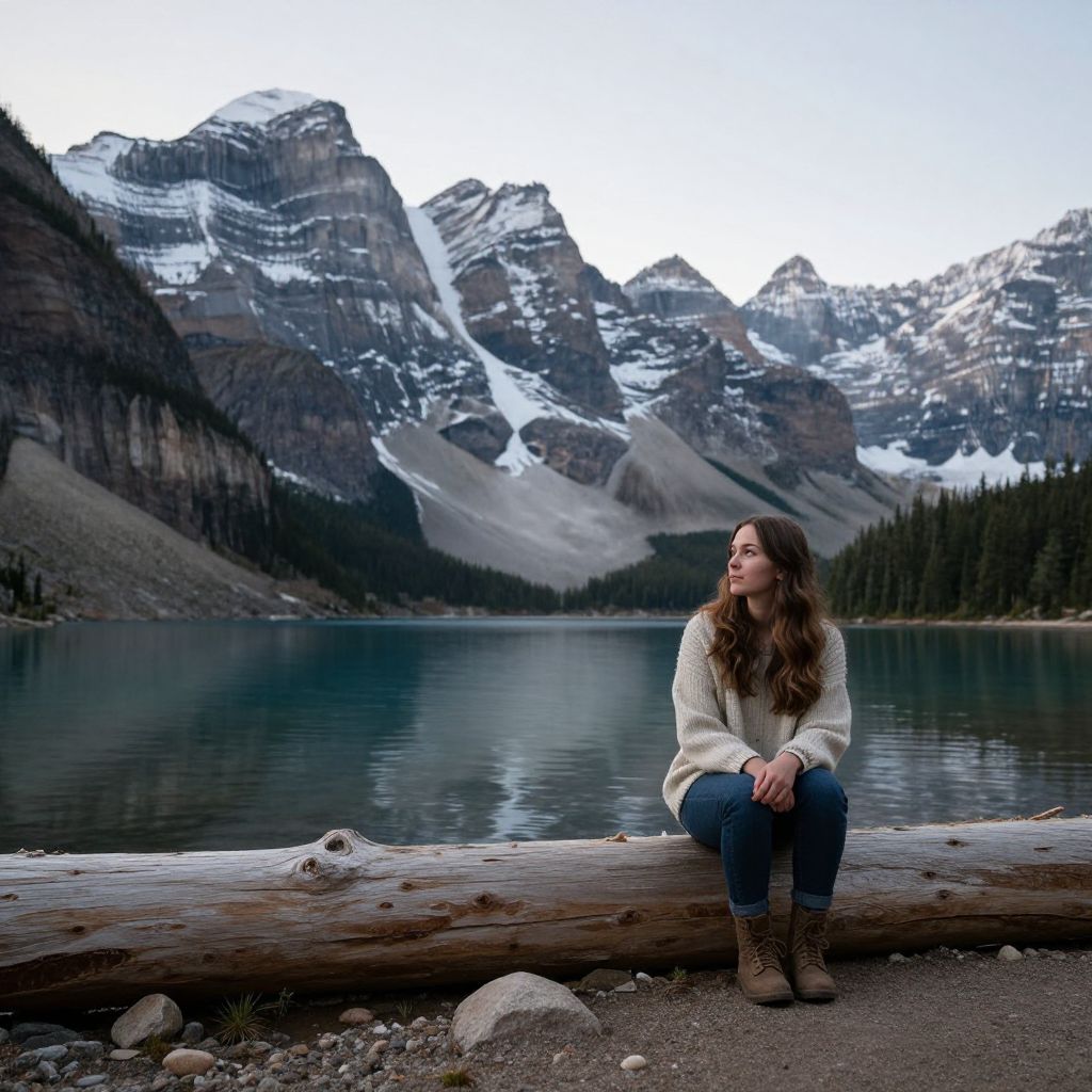 Serenity washes over the soul as a woman sits on driftwood by Lake Moraine, her gaze lost in the majestic embrace of snow-capped peaks, where the stillness of the water mirrors the quiet introspection of the moment.
