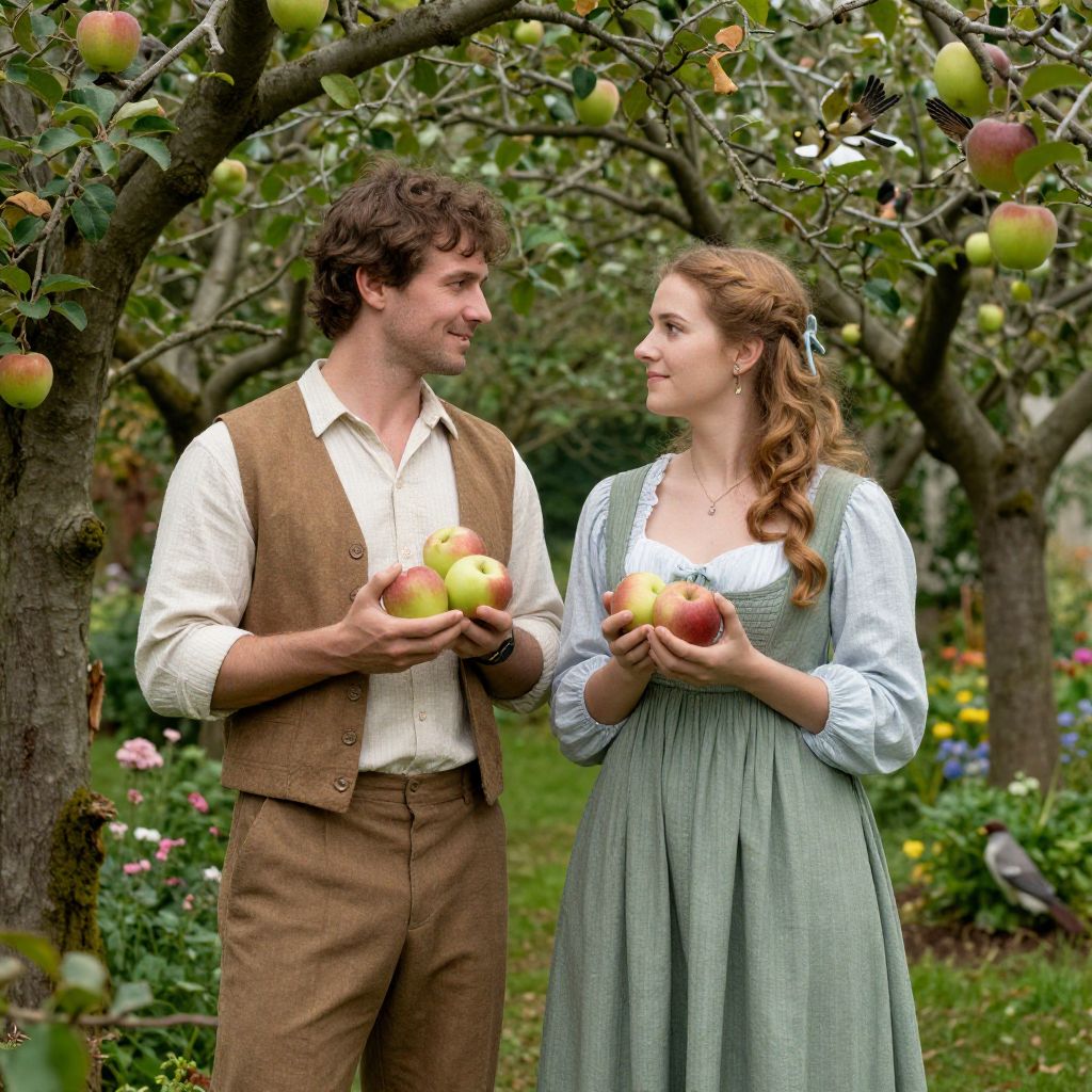Photograph of a Caucasian couple standing in an apple orchard. The man, with curly brown hair and a light brown vest over a white shirt, holds a red and yellow apple. The woman, with long, wavy blonde hair tied back with a ribbon, wears a white blouse under a green pinafore dress and holds a similar apple. They smile at each other, surrounded by apple trees with green and red apples. The background features lush greenery and blurred flowers, creating a picturesque, romantic setting. The image has a vibrant, natural color palette.