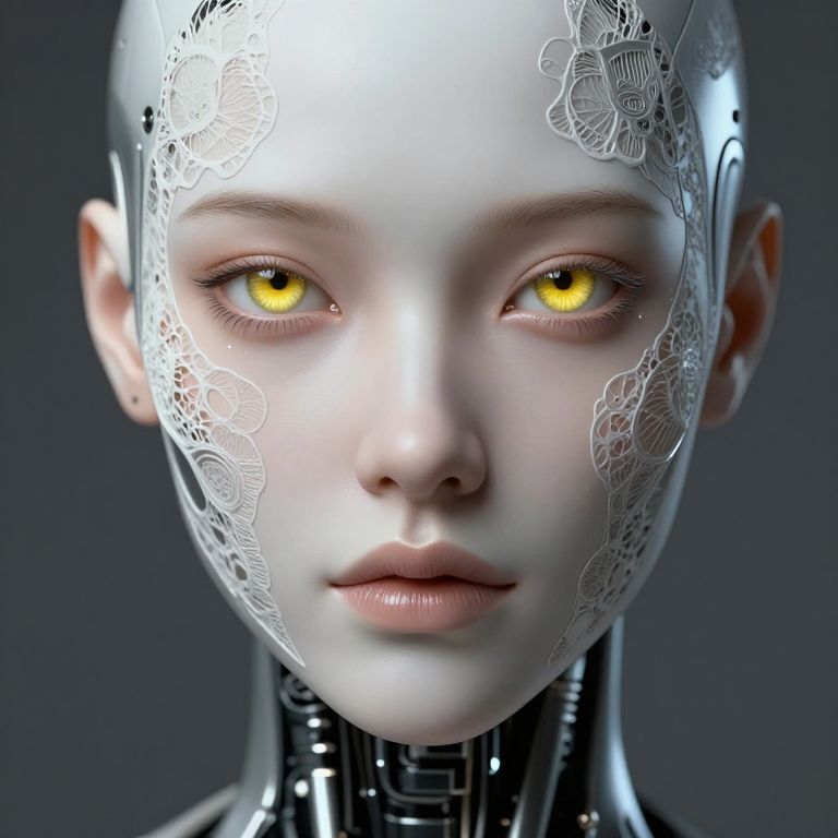 The image showcases a highly detailed, ultra-realistic female android with a strikingly emotive expression. The android's skin is porcelain-like, with a smooth, almost flawless texture that contrasts with the intricate, metallic lace patterns adorning her face. Her eyes are a striking ice yellow, set within a face that is both human-like and mechanical, featuring a blend of organic and synthetic elements. The android's eyes are accentuated with fine, delicate lines and dots, adding to the lifelike quality of her appearance. The background is a muted, dark gray, which helps to highlight the android's features and the intricate details of her design. The overall composition is balanced, with the android's face taking center stage, surrounded by the subtle, yet complex, mechanical patterns that cover her skin. The image is a testament to the advanced capabilities of digital art, capturing both the beauty and complexity of human-like features in a mechanical form.