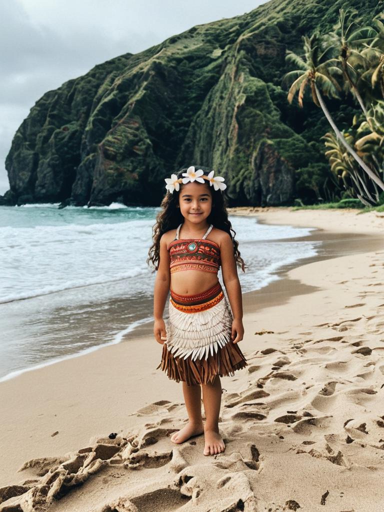 Child in Moana Costume, photorealistic full-body cosplay photo in outdoor beach setting