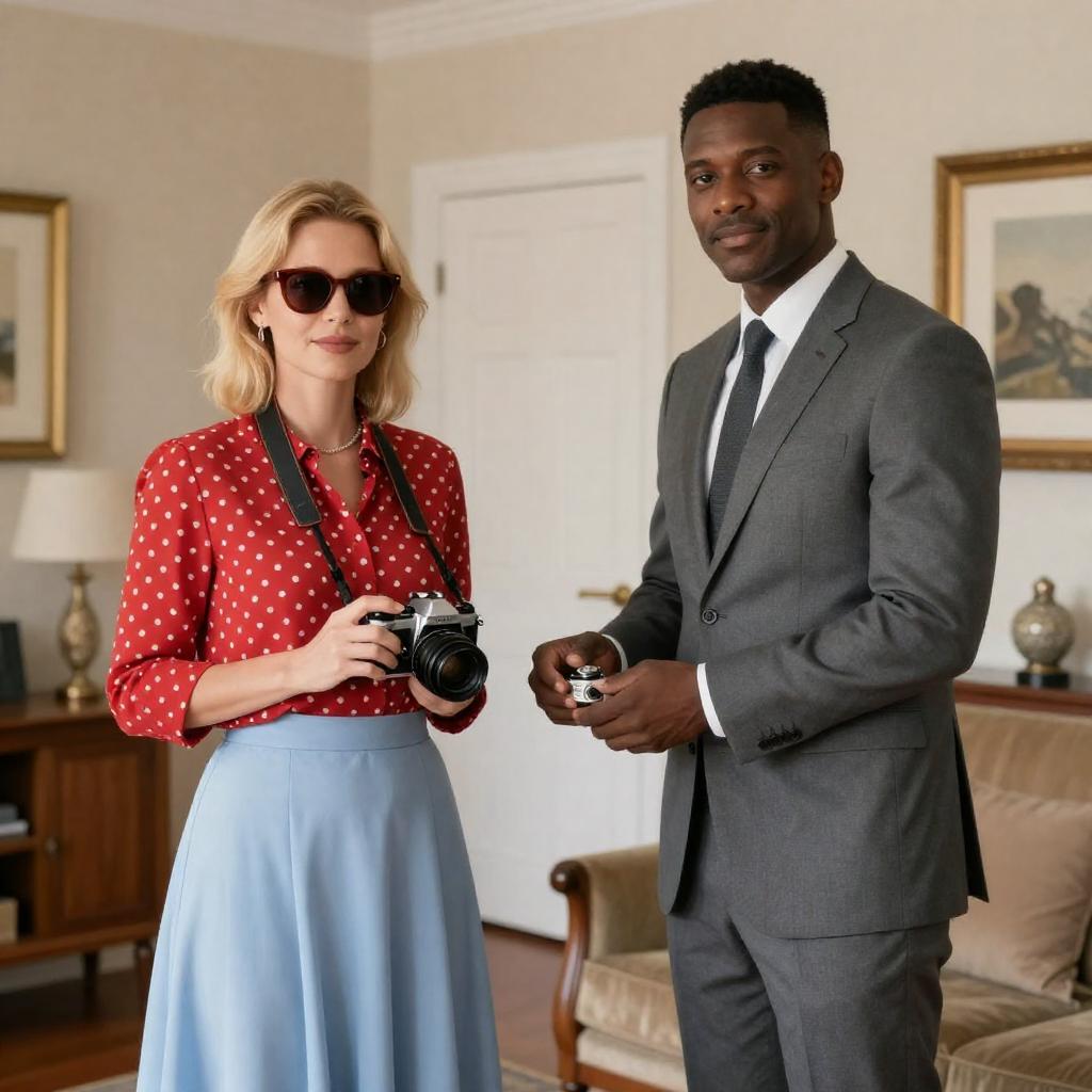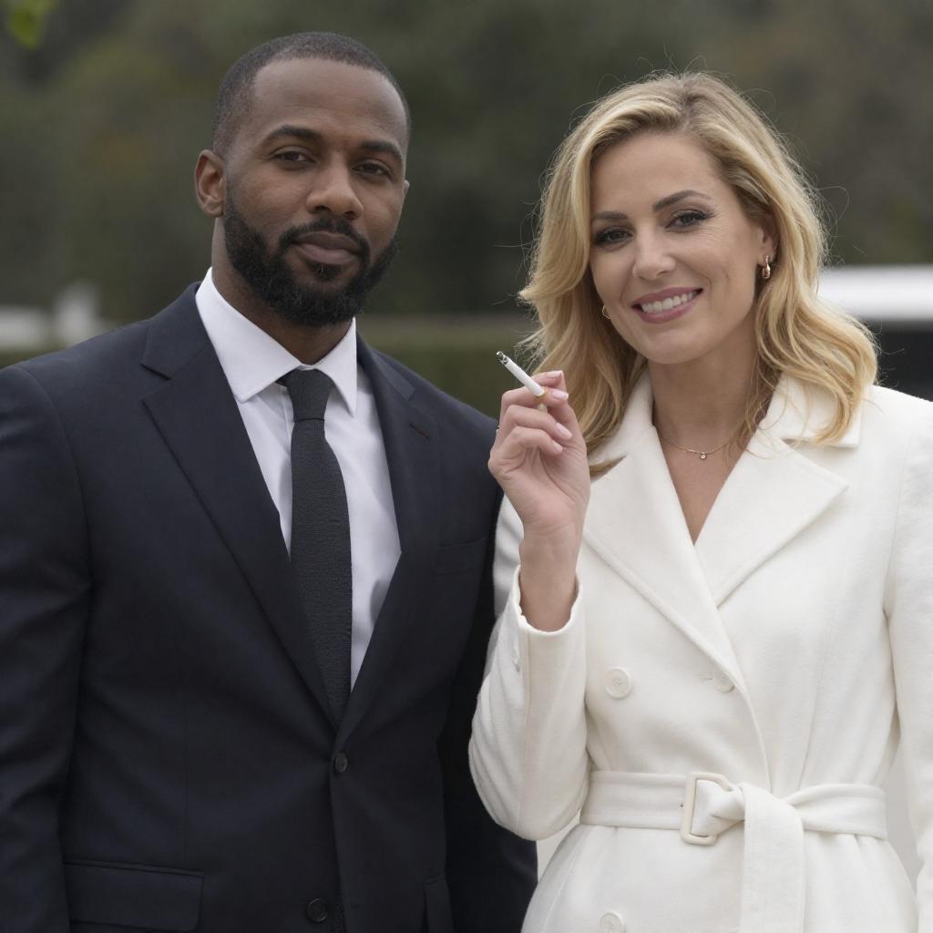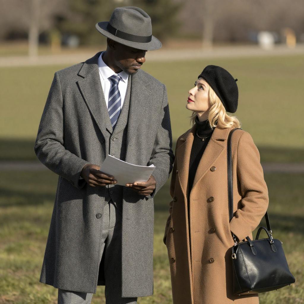 Photograph of two people walking. Black man in beige coat, black hat, white shirt, and brown tie, smiling. Blonde woman in green dress, black coat, smiling. Stone building background, black iron fence, statues. Man's left arm around woman's waist.