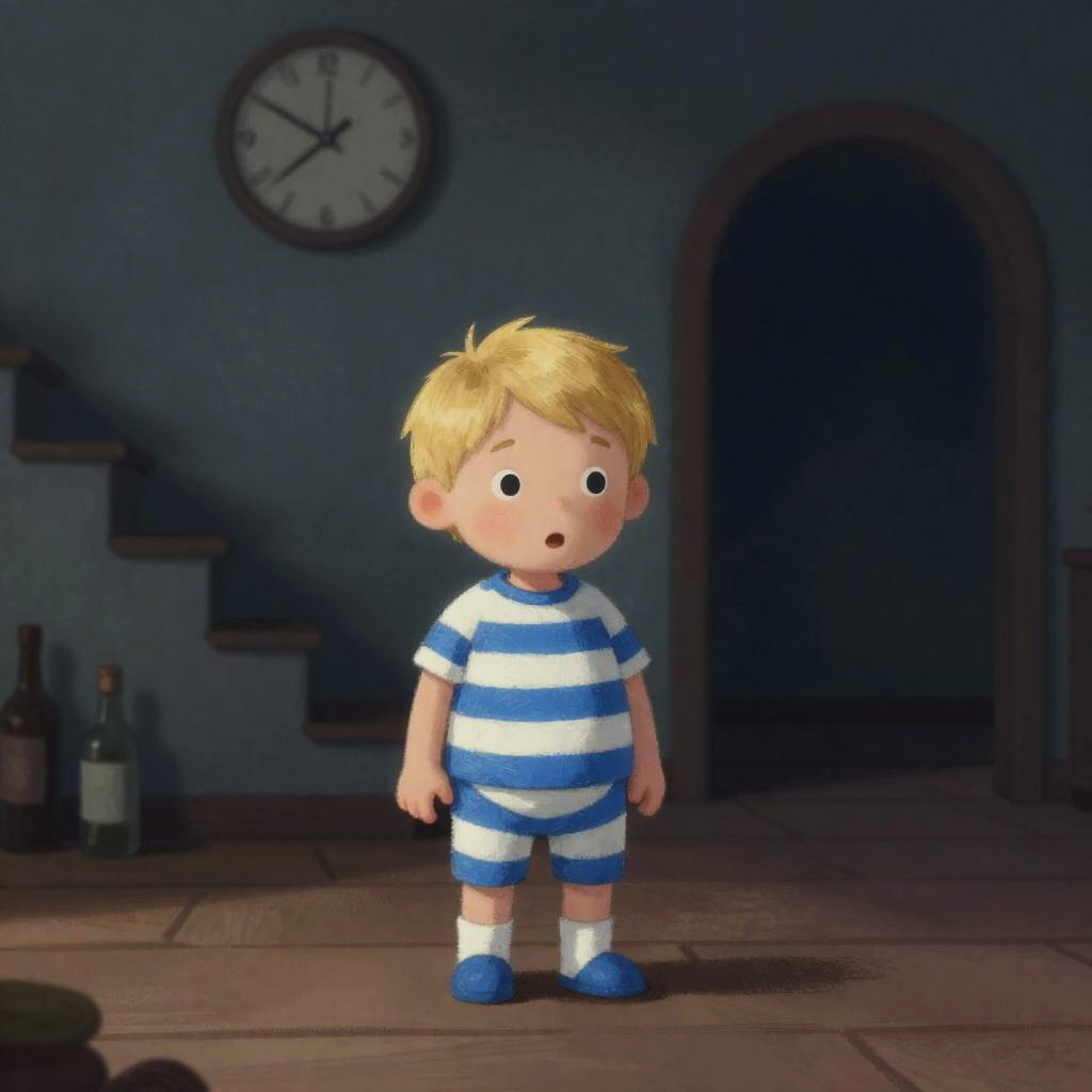 Digital illustration of a dimly lit bedroom with green walls. A blonde child wearing a blue and white striped shirt and blue shorts is bending over a wooden crate on the floor. The room features a simple bed with blue bedding, a cardboard box on the floor, a clock showing 8:00, a calendar with a dog image, a window with a dark night scene, and a hanging light bulb providing warm light.