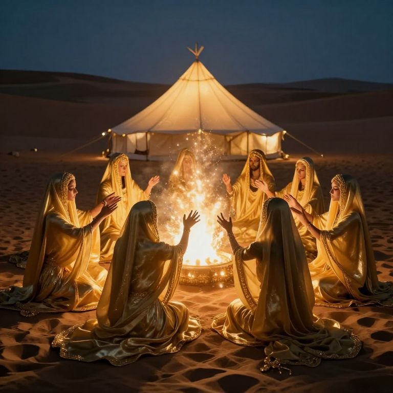 In the heart of the desert, ethereal figures draped in golden veils gather around a radiant, illuminated tent, their outstretched arms weaving a spell of serenity and mystery, where the interplay of light and shadow transforms the sands into a canvas of timeless wonder.