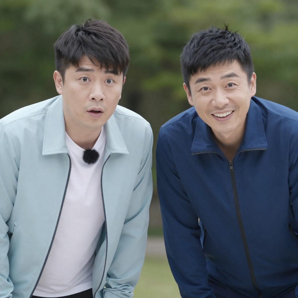 Photo of two Asian men standing next to a tree at night. The man on the left is wearing a gray suit with a white shirt, smiling and hugging the tree. The man on the right has dark hair, is wearing a red vest over a green jacket, and has a surprised expression. Background features colorful string lights and blurred city lights, creating a nighttime urban atmosphere.